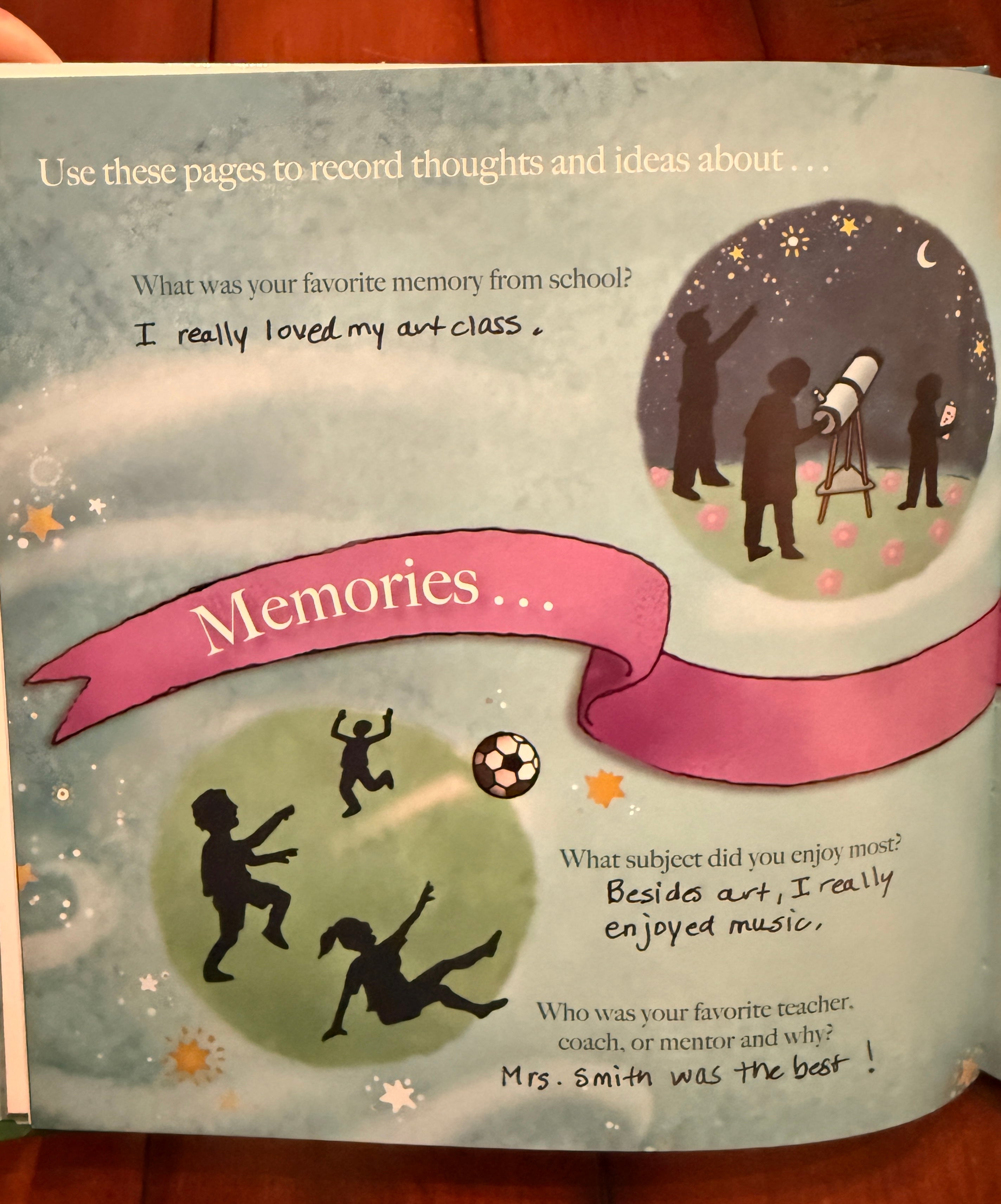 Prompts for graduate to record school memories and future aspirations.